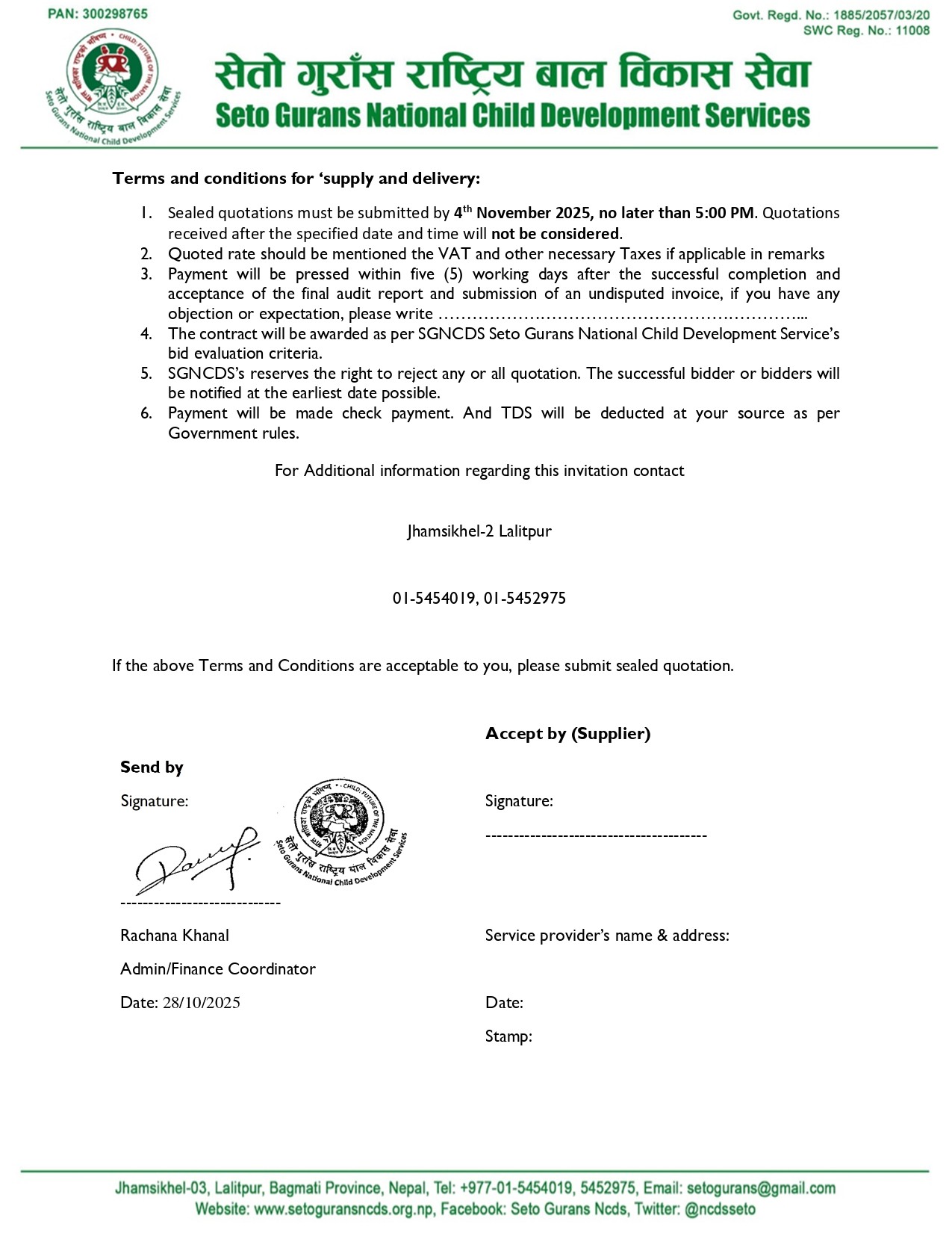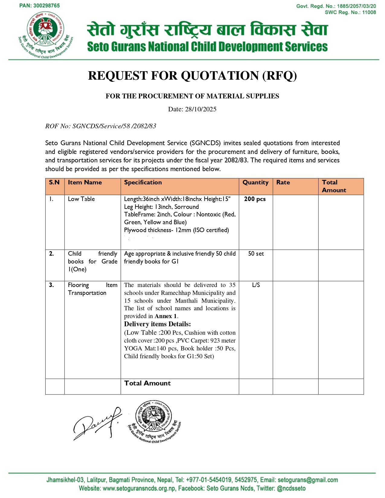 Request for sealed Quotation [Furniture, Books and Transportation Services]
